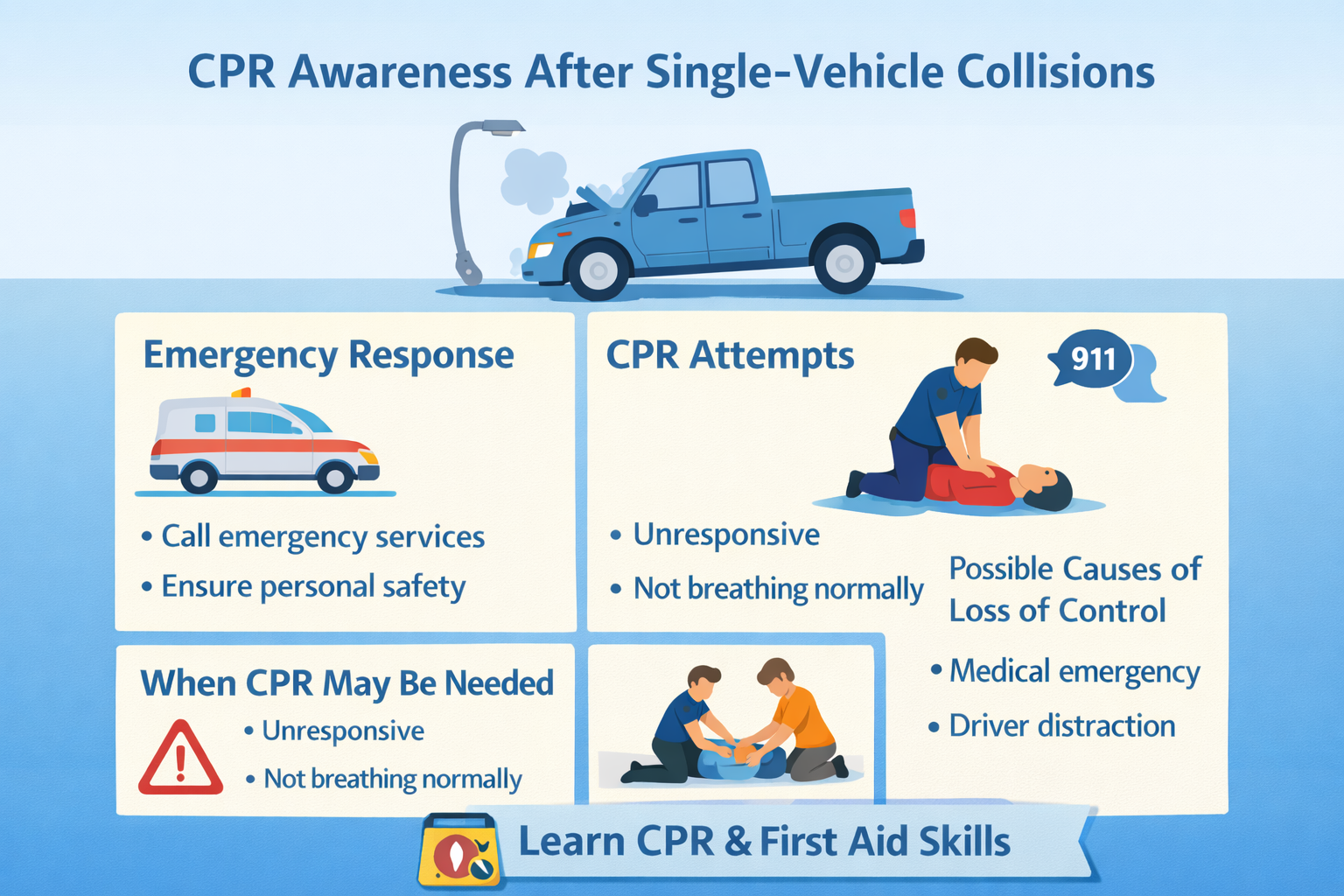 Single-vehicle crashes sometimes occur when a driver suddenly becomes unwell or loses control of a vehicle. In these situations, a person may become unresponsive or stop breathing normally, which is when cardiopulmonary resuscitation (CPR) may be attempted by bystanders or emergency responders.