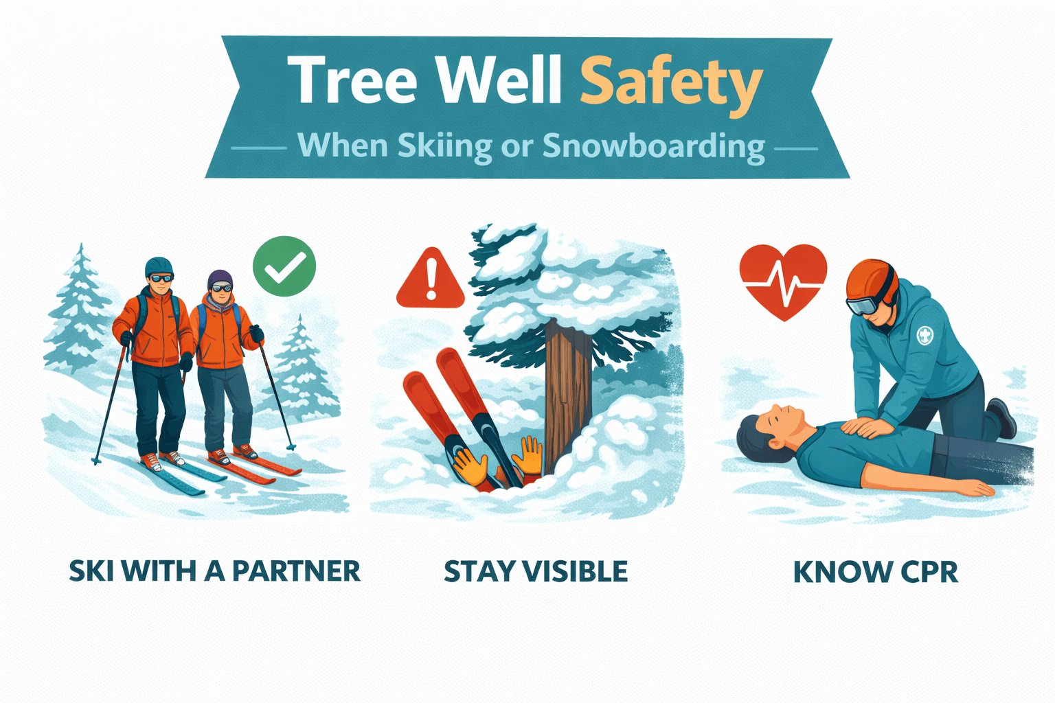 Mountain safety teams often encourage several precautions to reduce the risk of tree well incidents: