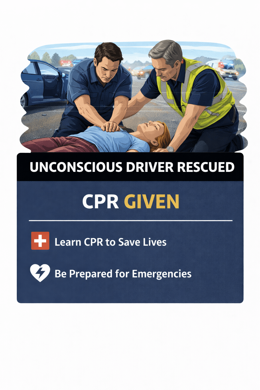 Once the driver was out of the vehicle, they checked for signs of breathing and circulation. When they could not detect a pulse, CPR was started immediately while emergency services were contacted.