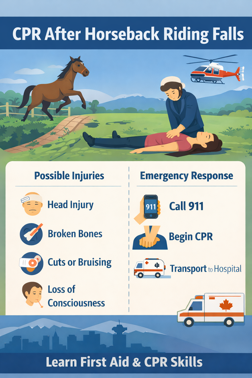 Horseback riding is a popular recreational activity across British Columbia, including Delta, Ladner, and the greater Vancouver region. While generally safe when proper precautions are followed, falls from horses can sometimes lead to serious injuries. In rare situations where a person becomes unresponsive or stops breathing after a fall, cardiopulmonary resuscitation (CPR) may be used as an emergency first aid measure until paramedics arrive.