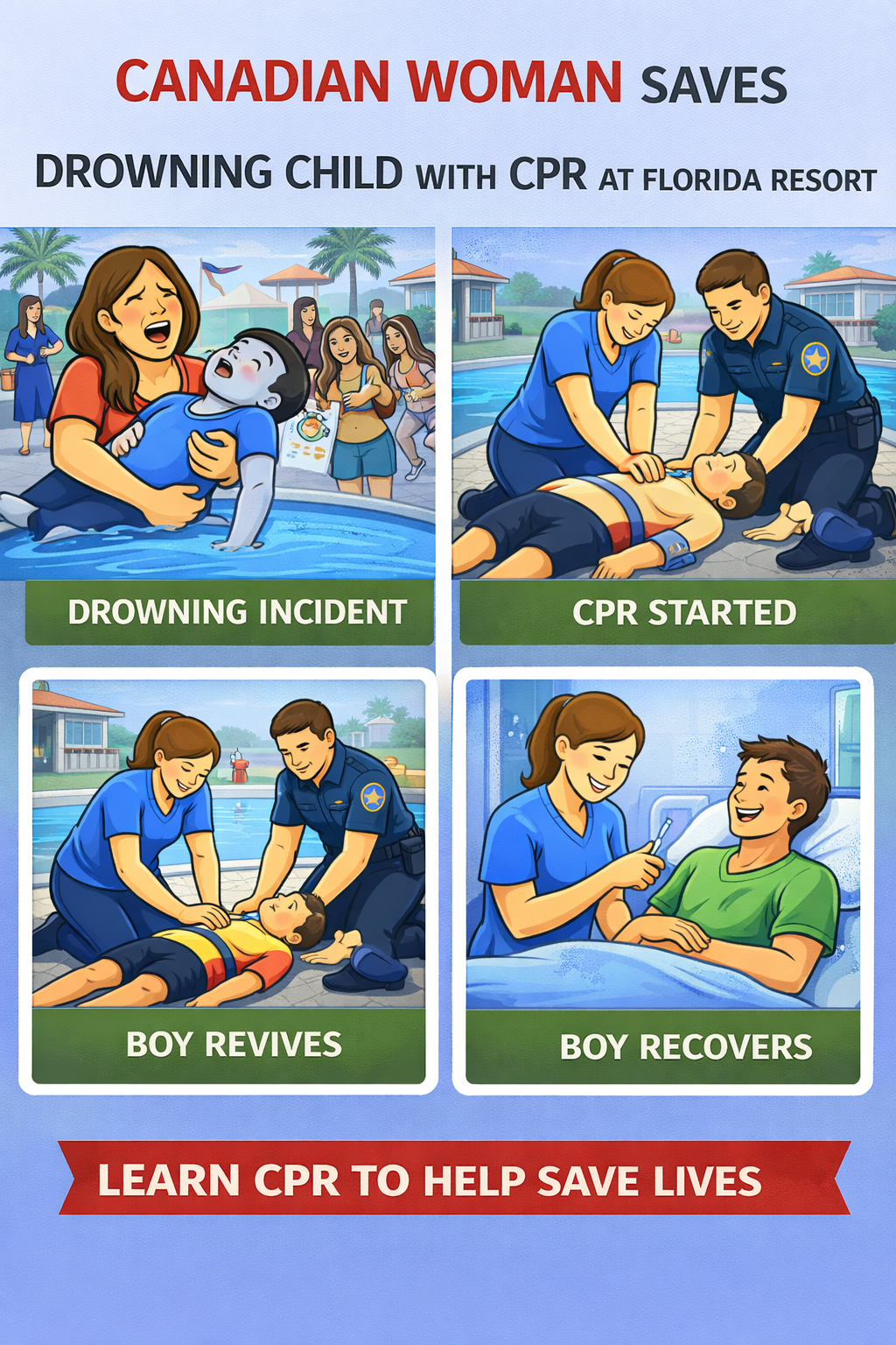 The incident highlights how recent CPR training and quick response from bystanders can support recovery during drowning emergencies.